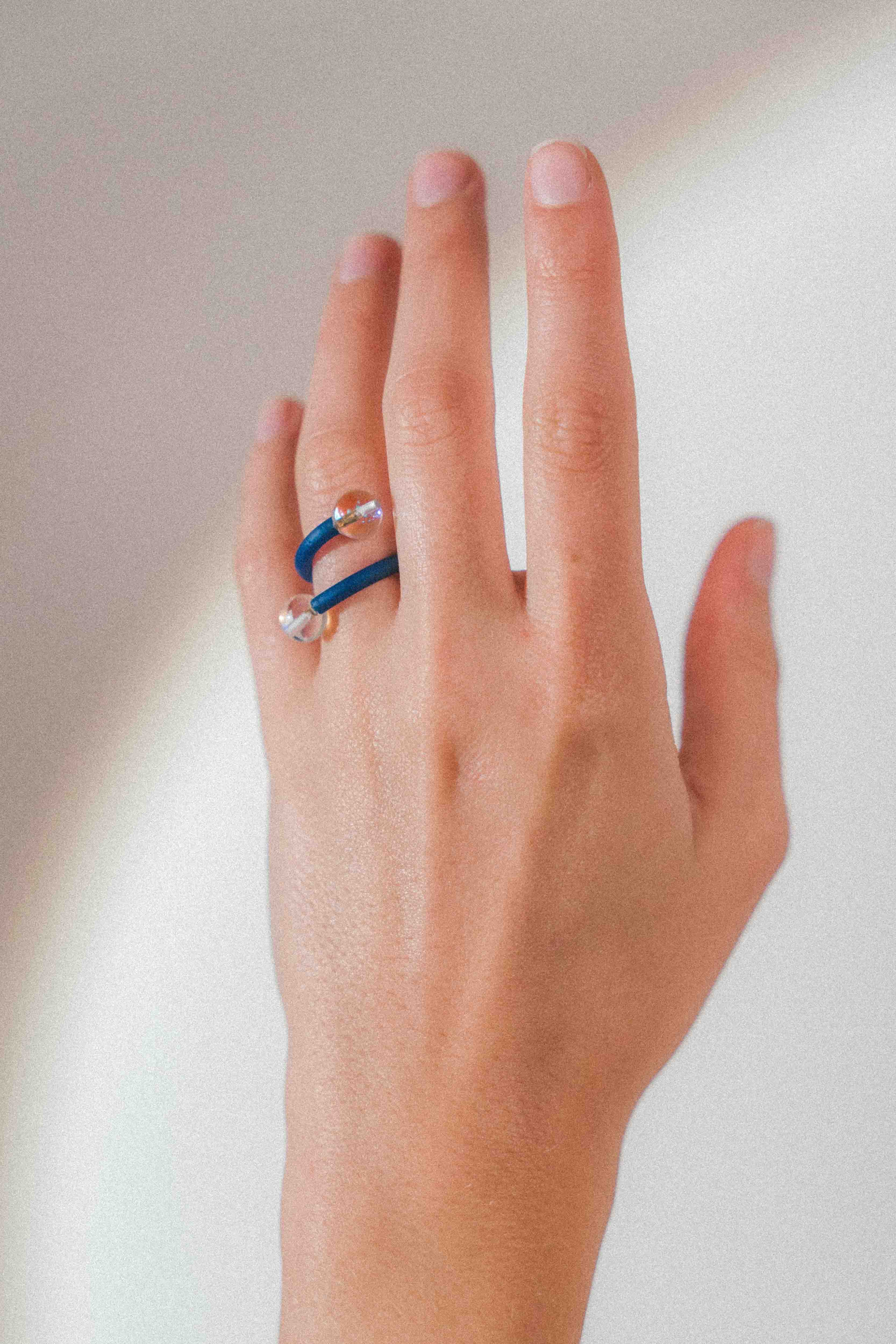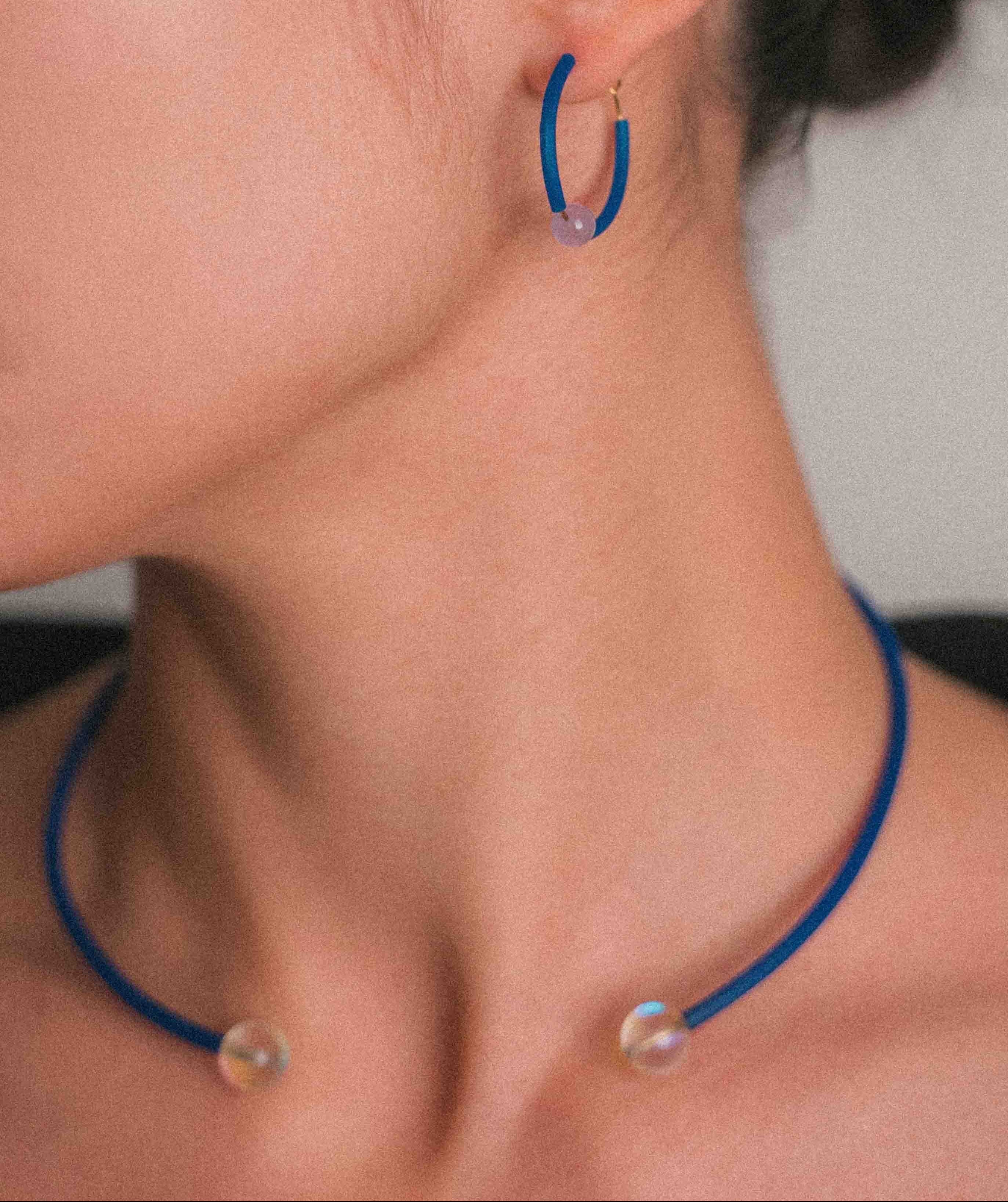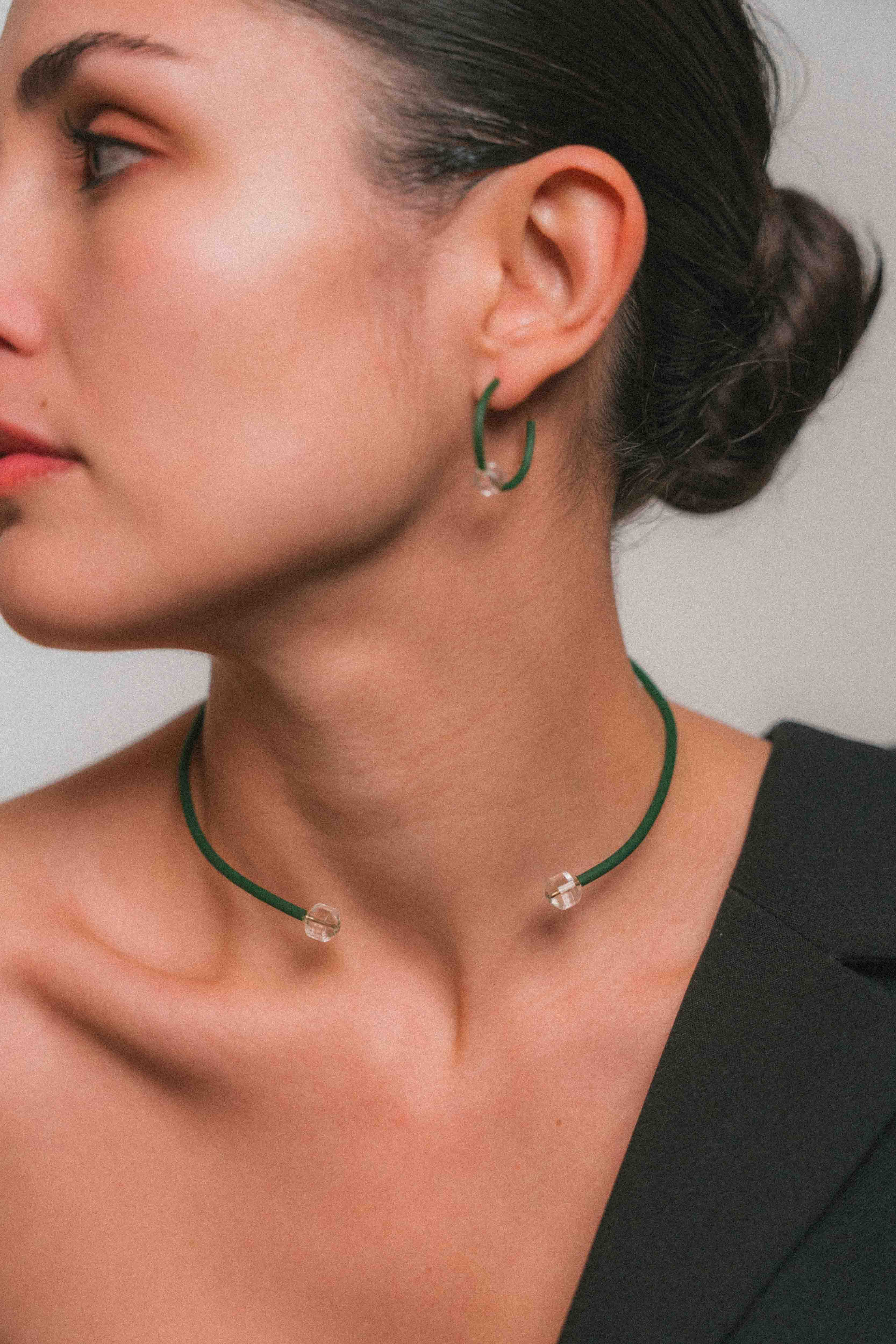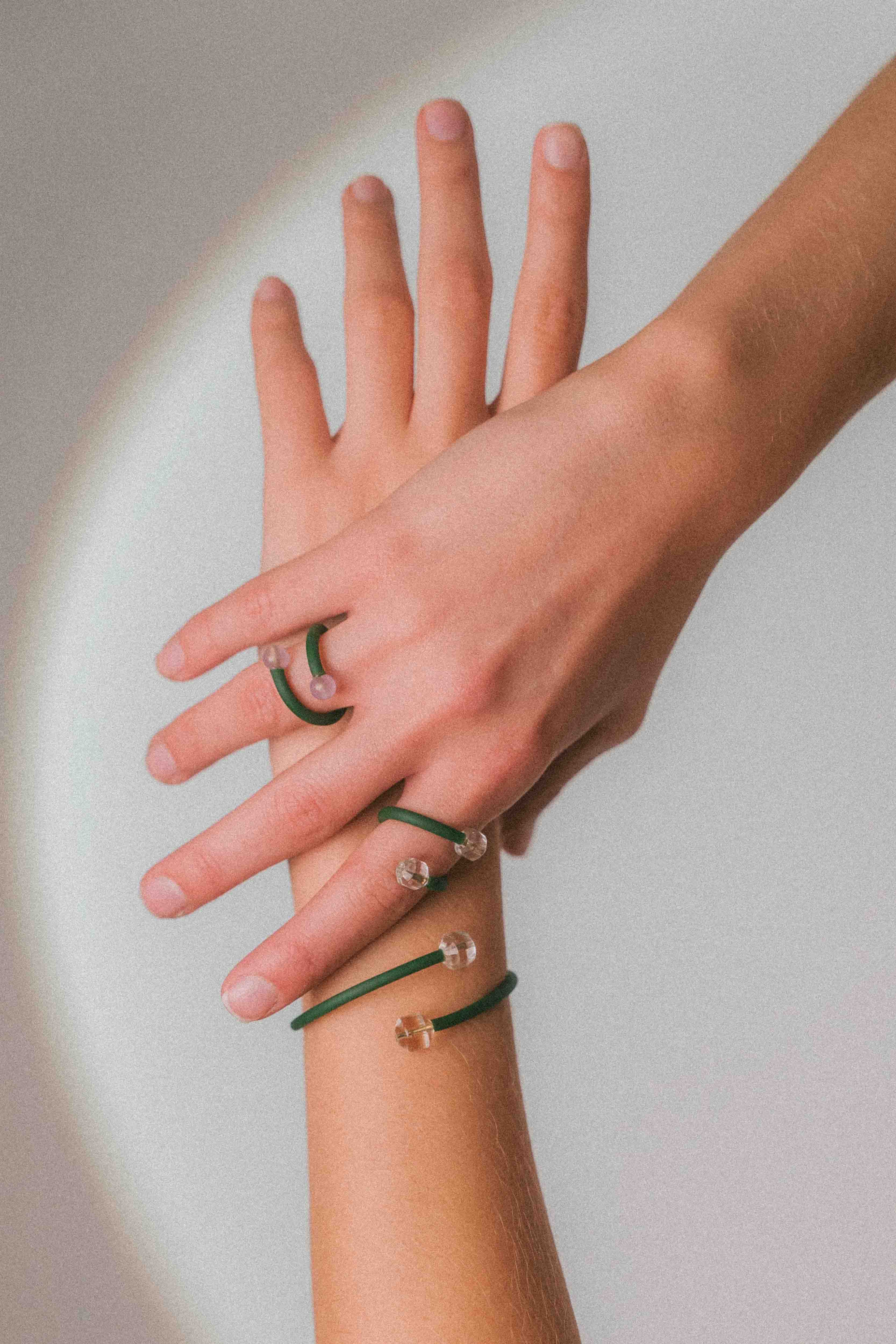 El cristal, presente en cada pieza, actúa como núcleo y punto de tensión. No es ornamento: es canal, claridad y equilibrio. El color aparece como soporte, mientras el metal traza un gesto limpio y contenido.