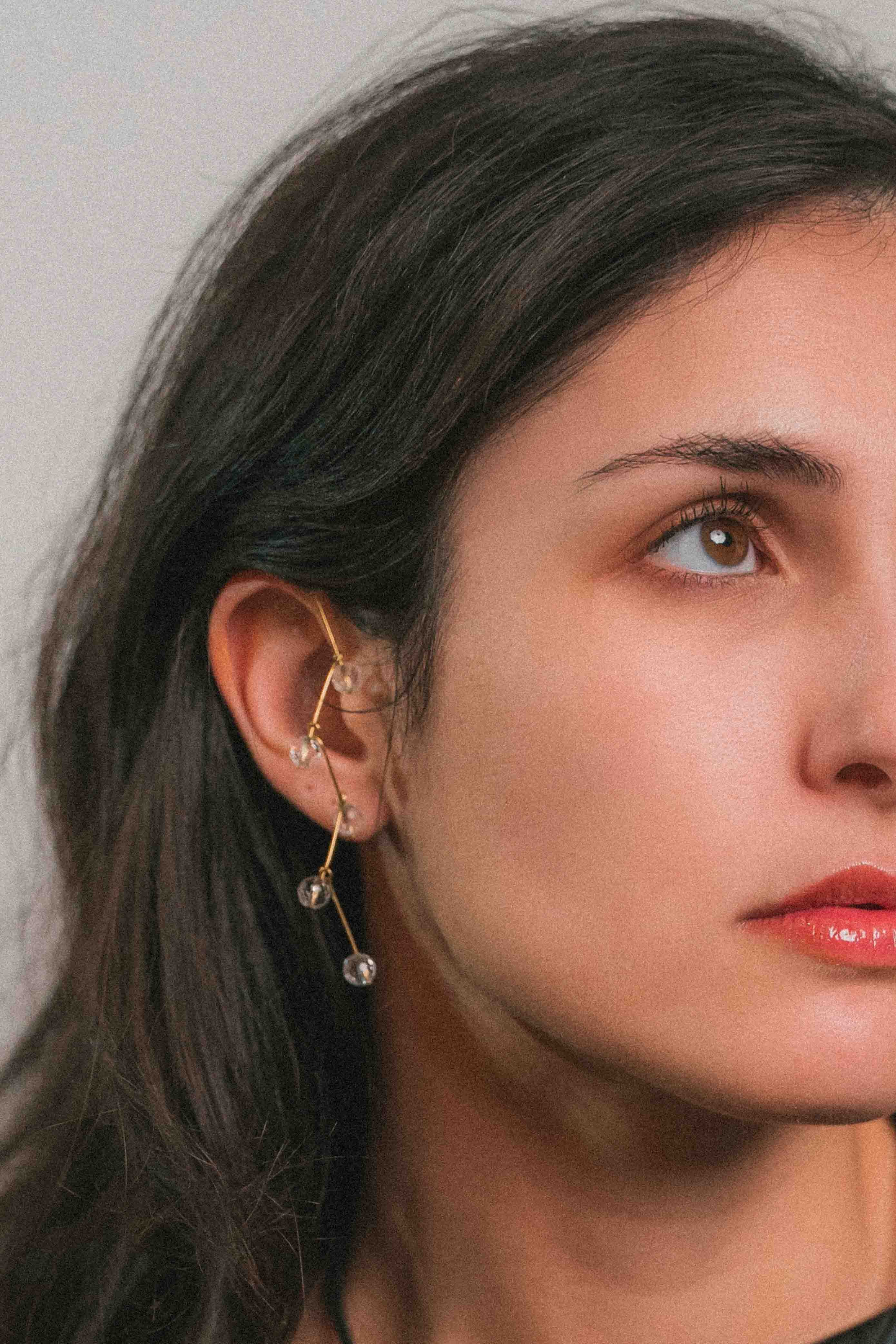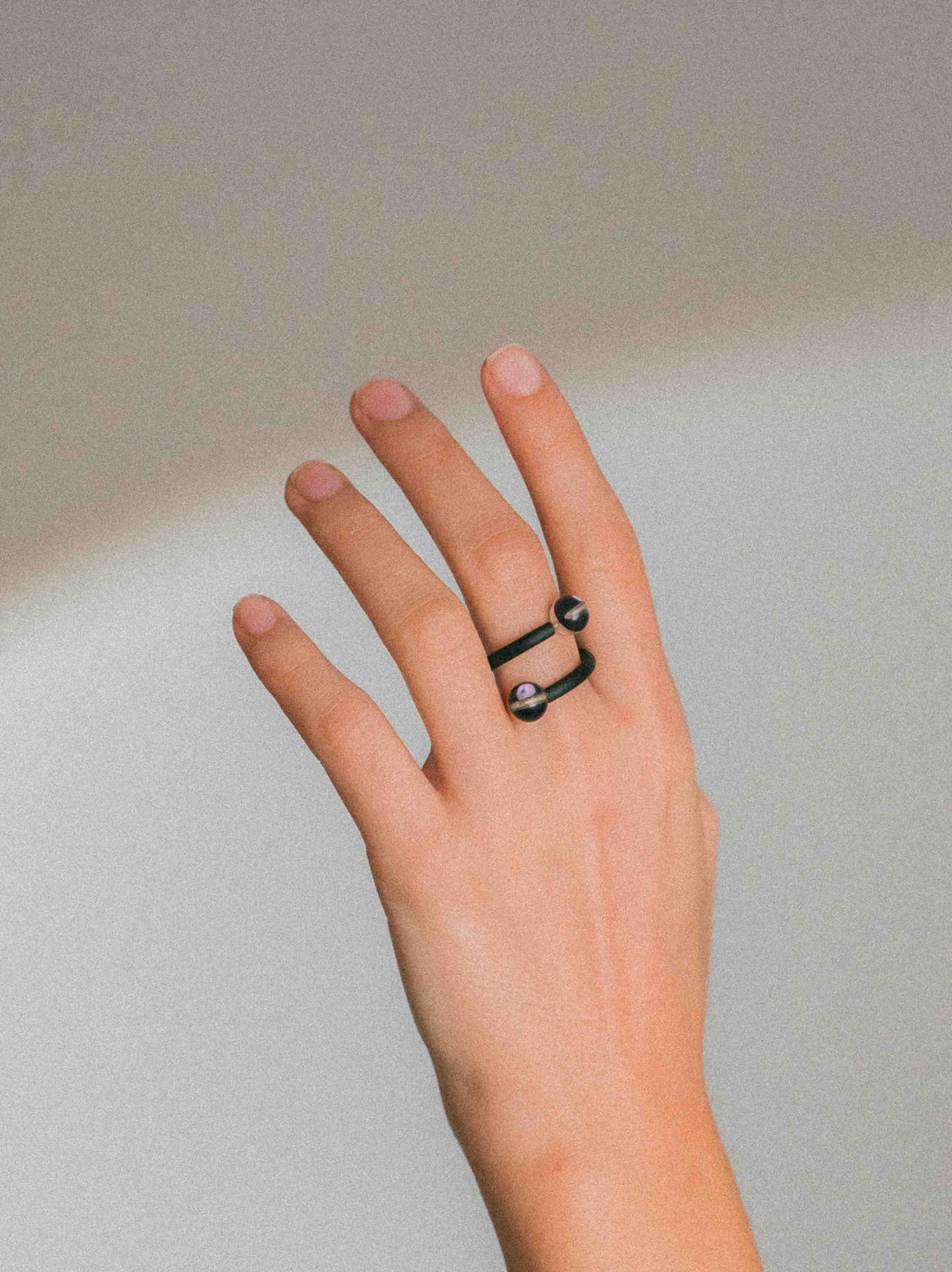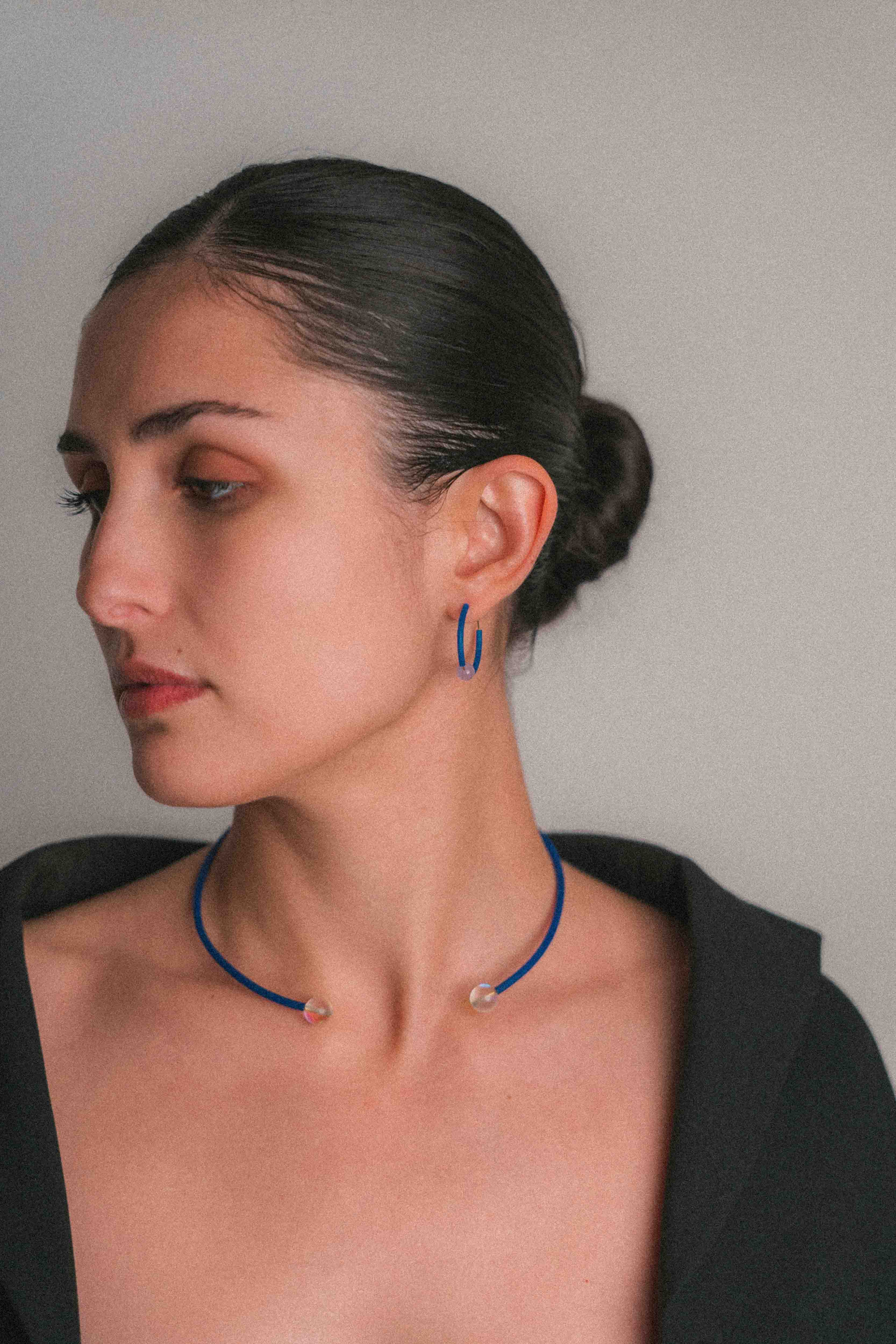 El cristal, presente en cada pieza, actúa como núcleo y punto de tensión. No es ornamento: es canal, claridad y equilibrio. El color aparece como soporte, mientras el metal traza un gesto limpio y contenido.