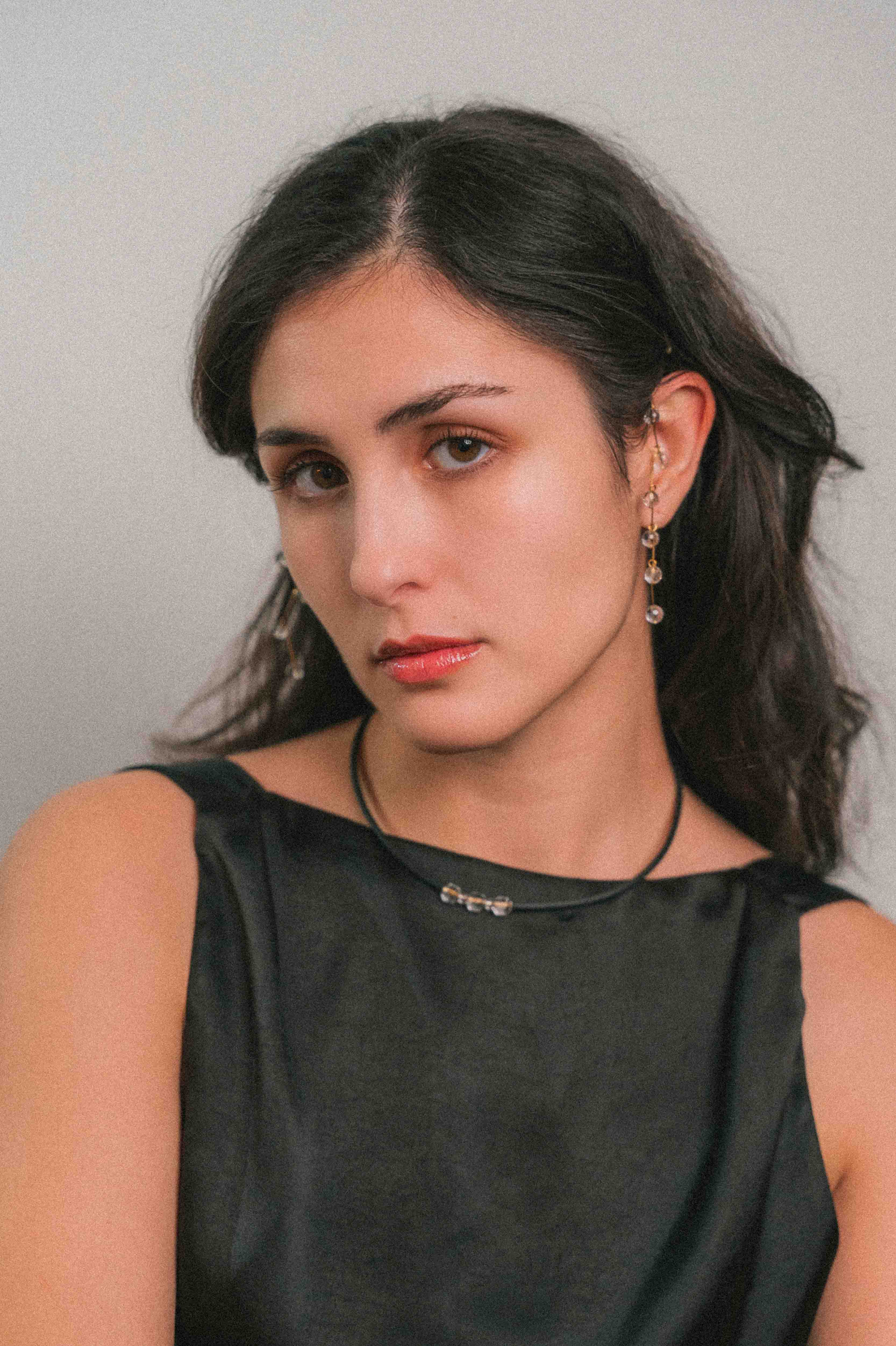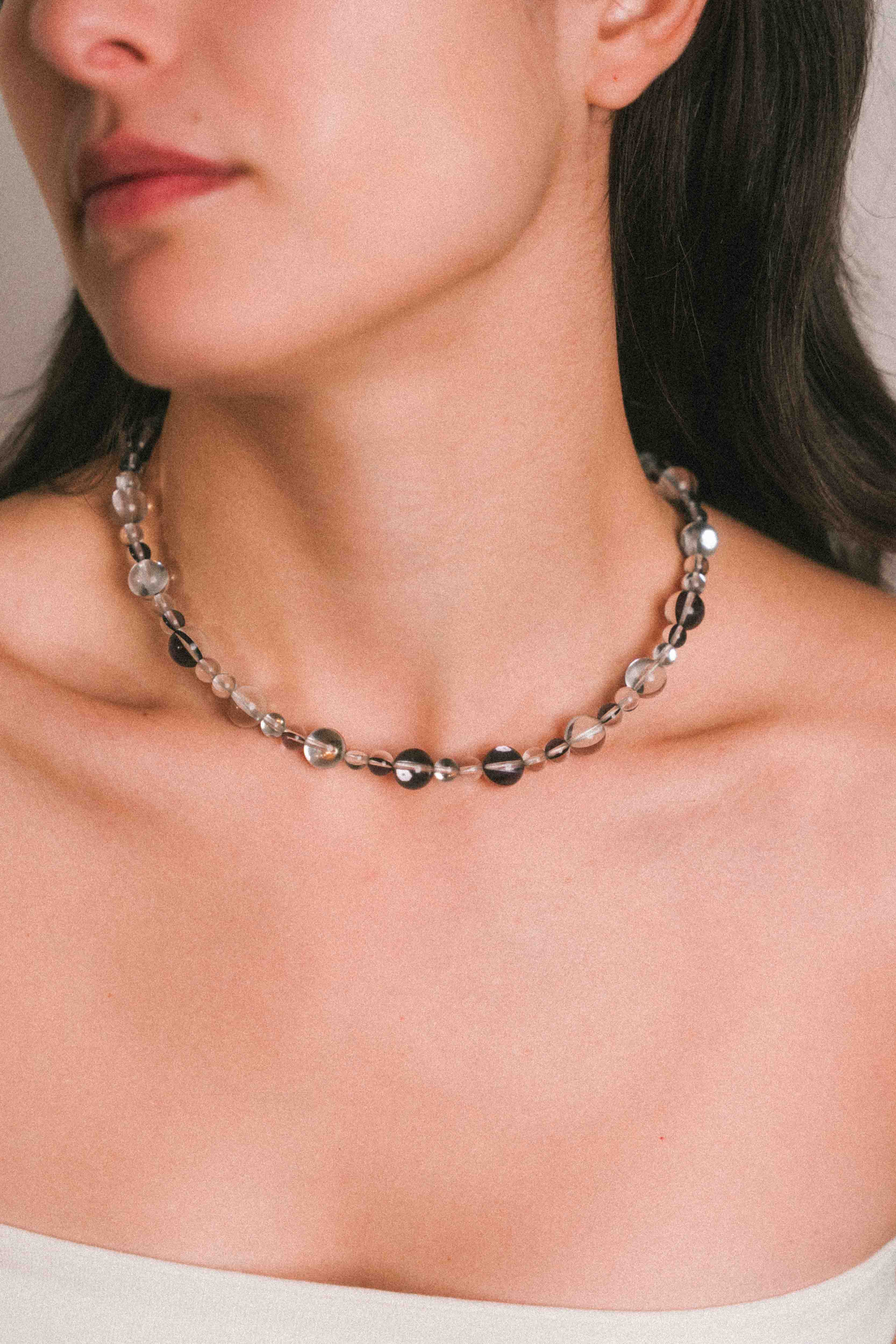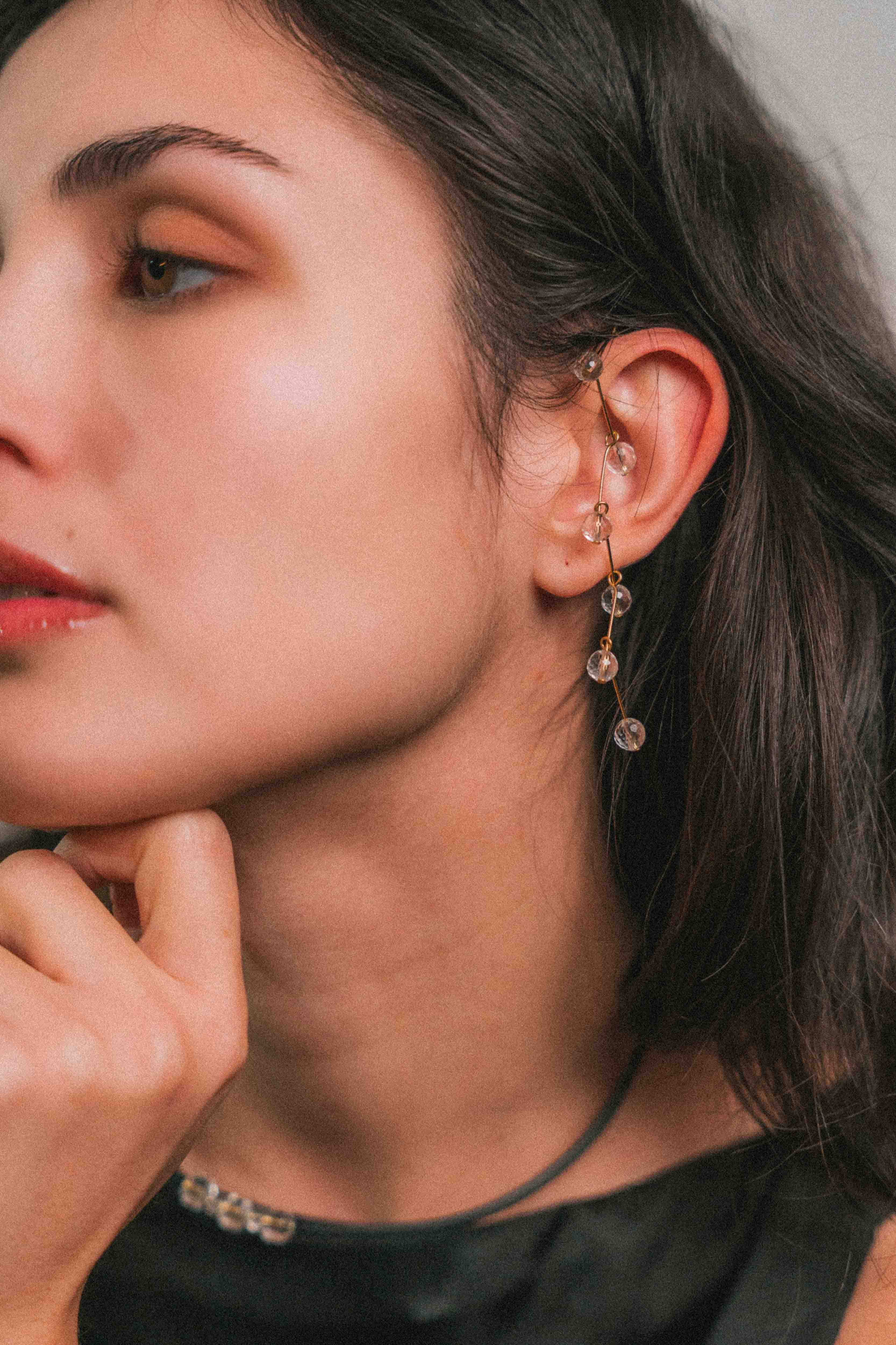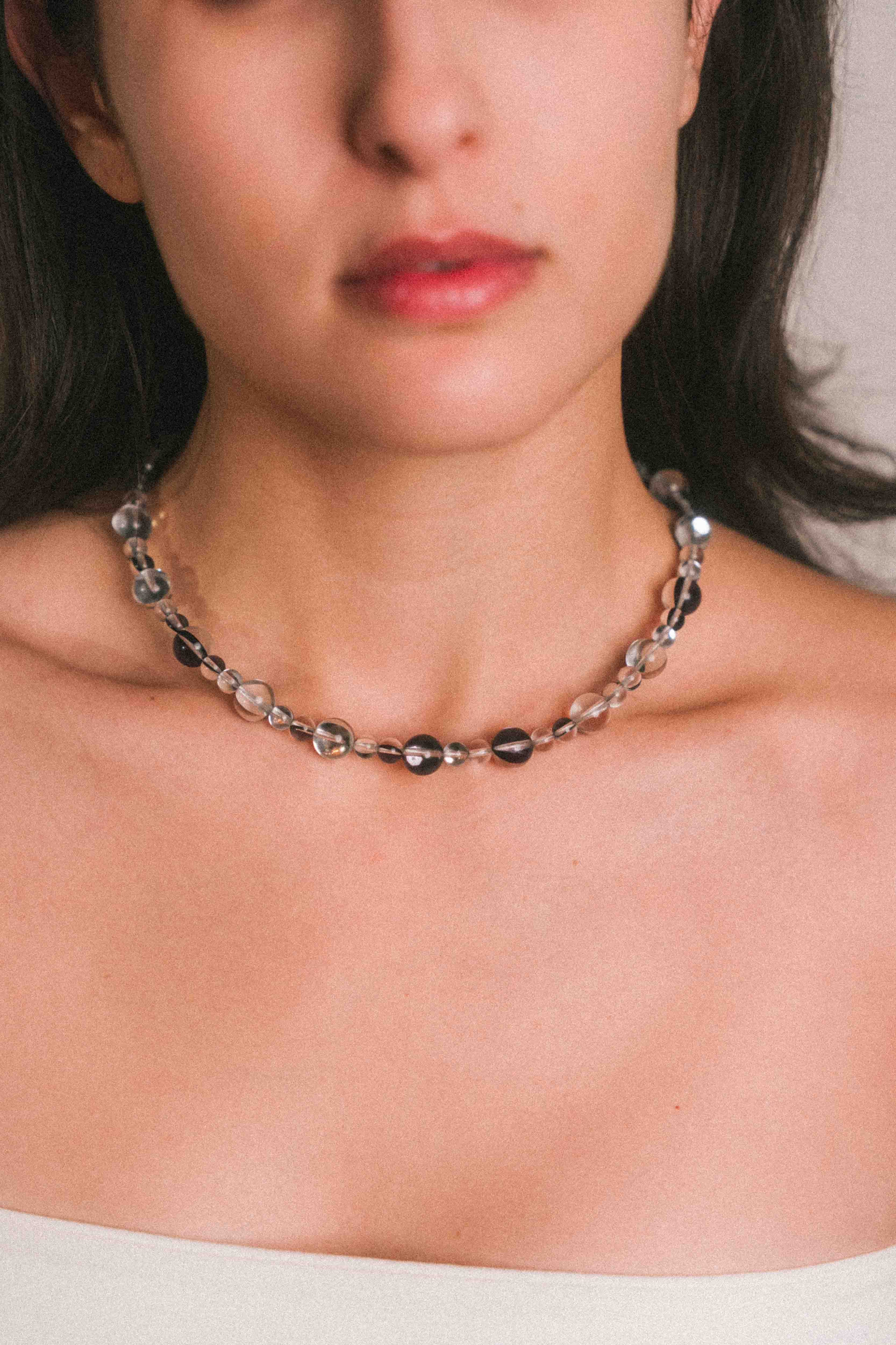 El cristal, presente en cada pieza, actúa como núcleo y punto de tensión. No es ornamento: es canal, claridad y equilibrio. El color aparece como soporte, mientras el metal traza un gesto limpio y contenido.