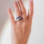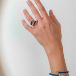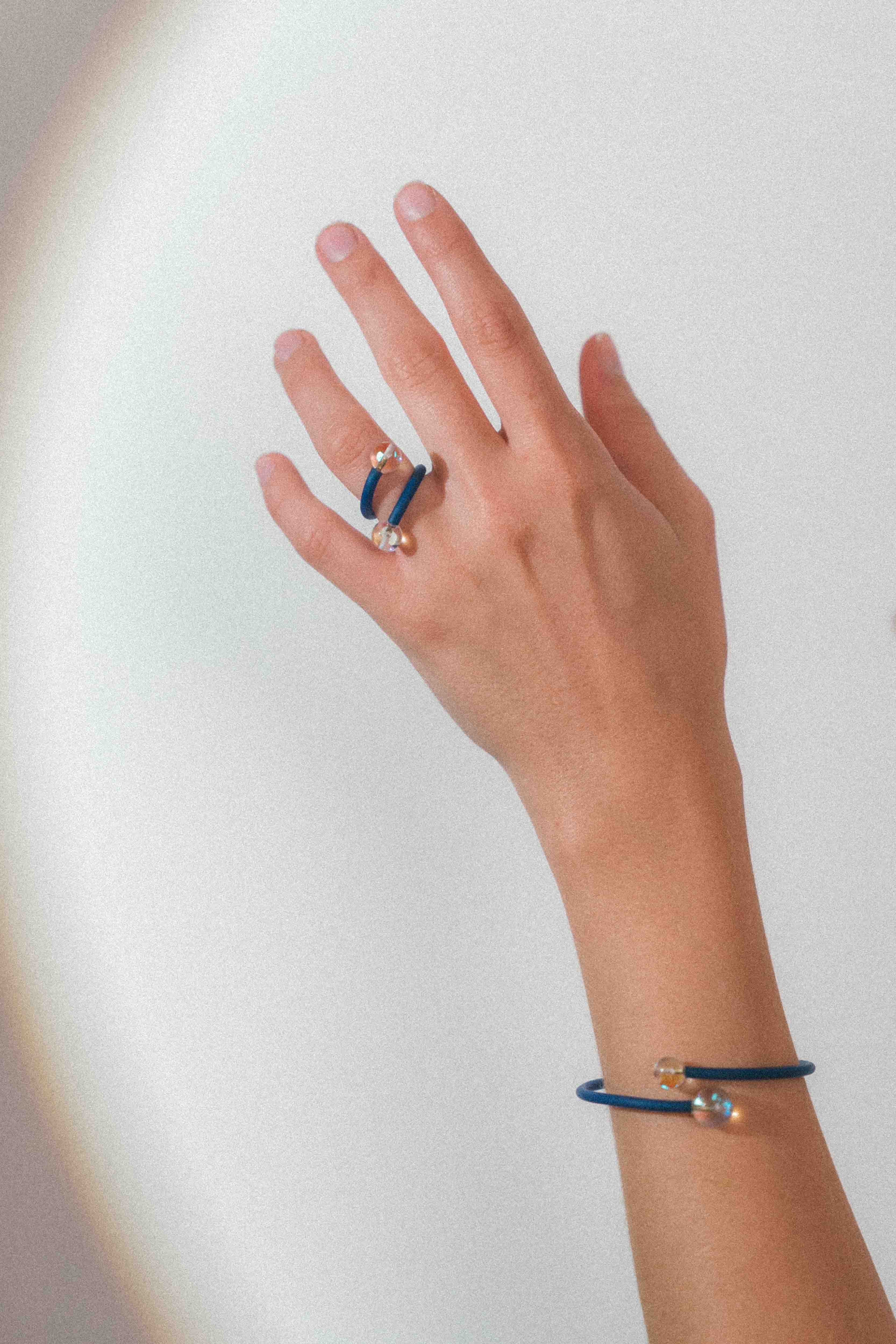 Realizado en metal flexible recubierto de elastómero técnico, se adapta cómodamente al dedo con un gesto ligero. Los extremos se rematan con vidrio iriscente, que refleja la luz con matices sutiles y cambiantes, aportando luminosidad y profundidad a la pieza.