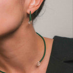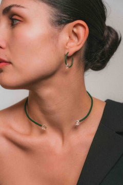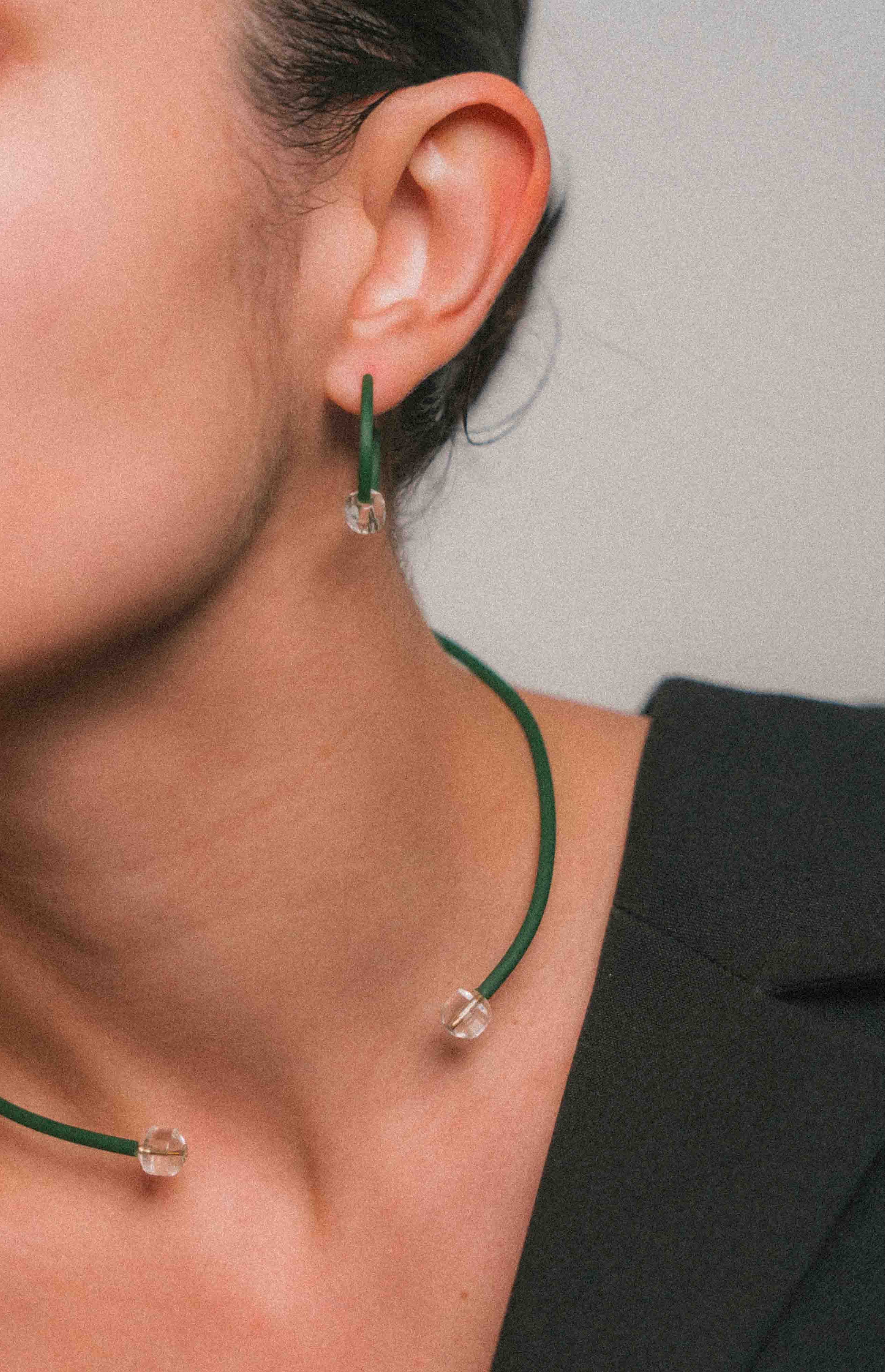Estos pendientes reinterpretan el aro clásico desde una estética contemporánea, donde el caucho verde —flexible y ligero— se encuentra con el cuarzo transparente facetado, símbolo de claridad y equilibrio.