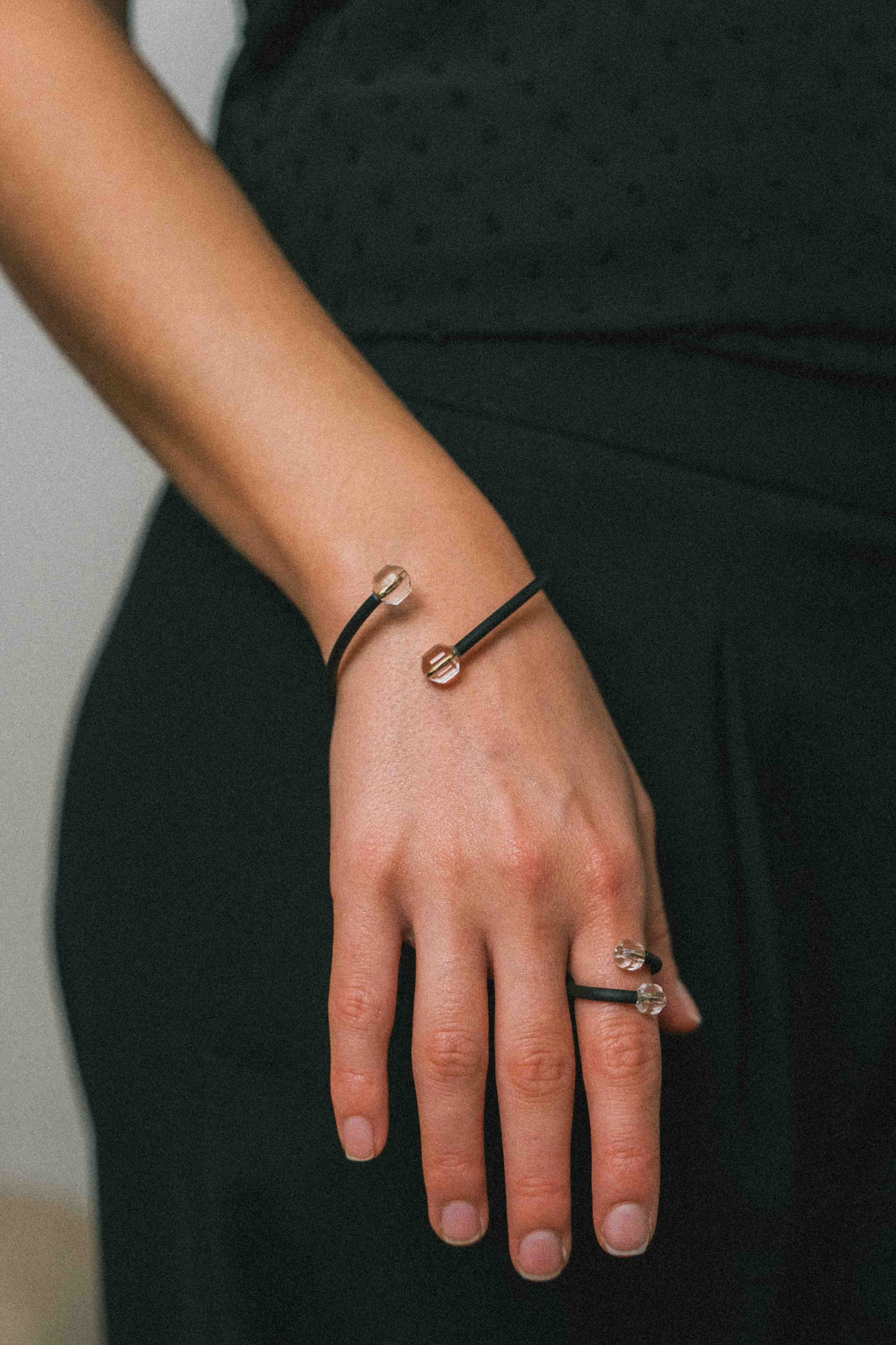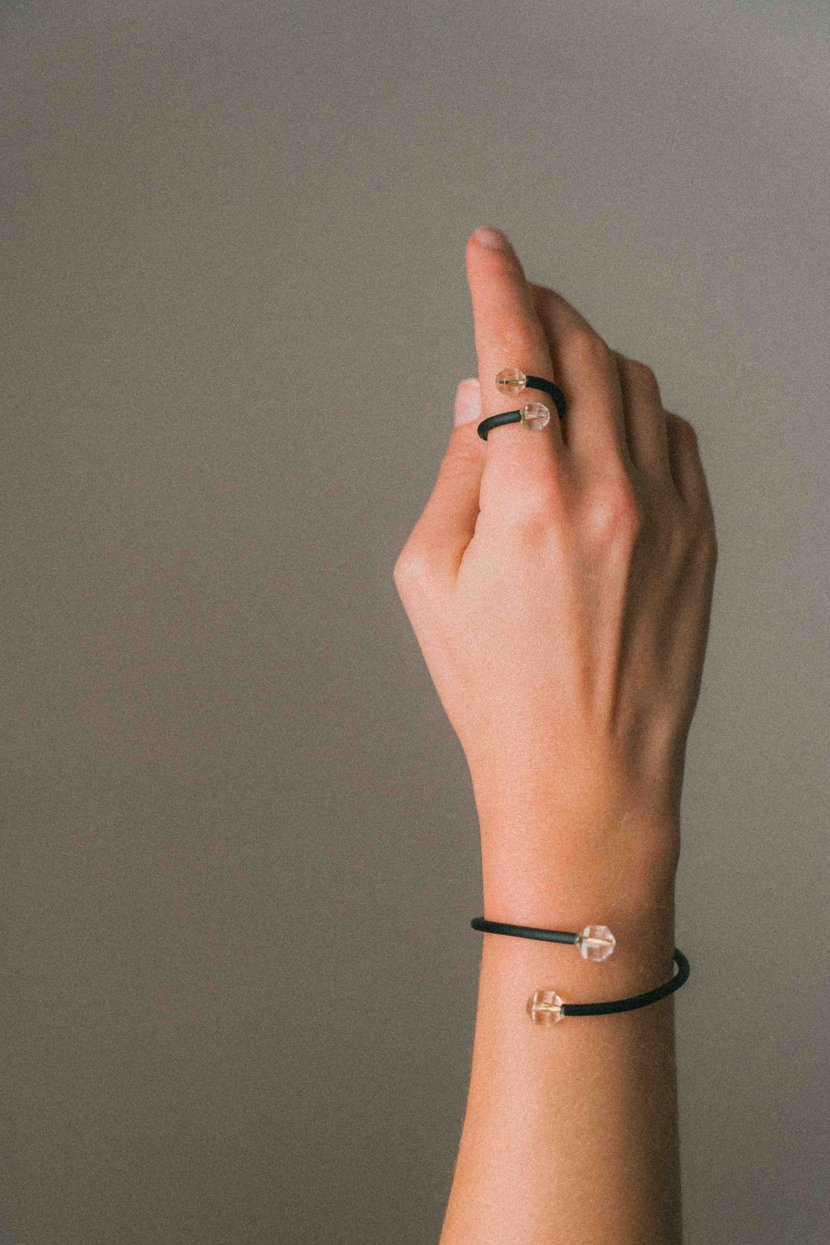 Realizado en metal flexible recubierto de elastómero técnico, se adapta suavemente al dedo, acompañando el movimiento de la mano. Los extremos se rematan con cuarzo cristal facetado, una piedra asociada a la claridad, la presencia y la amplificación de la luz.