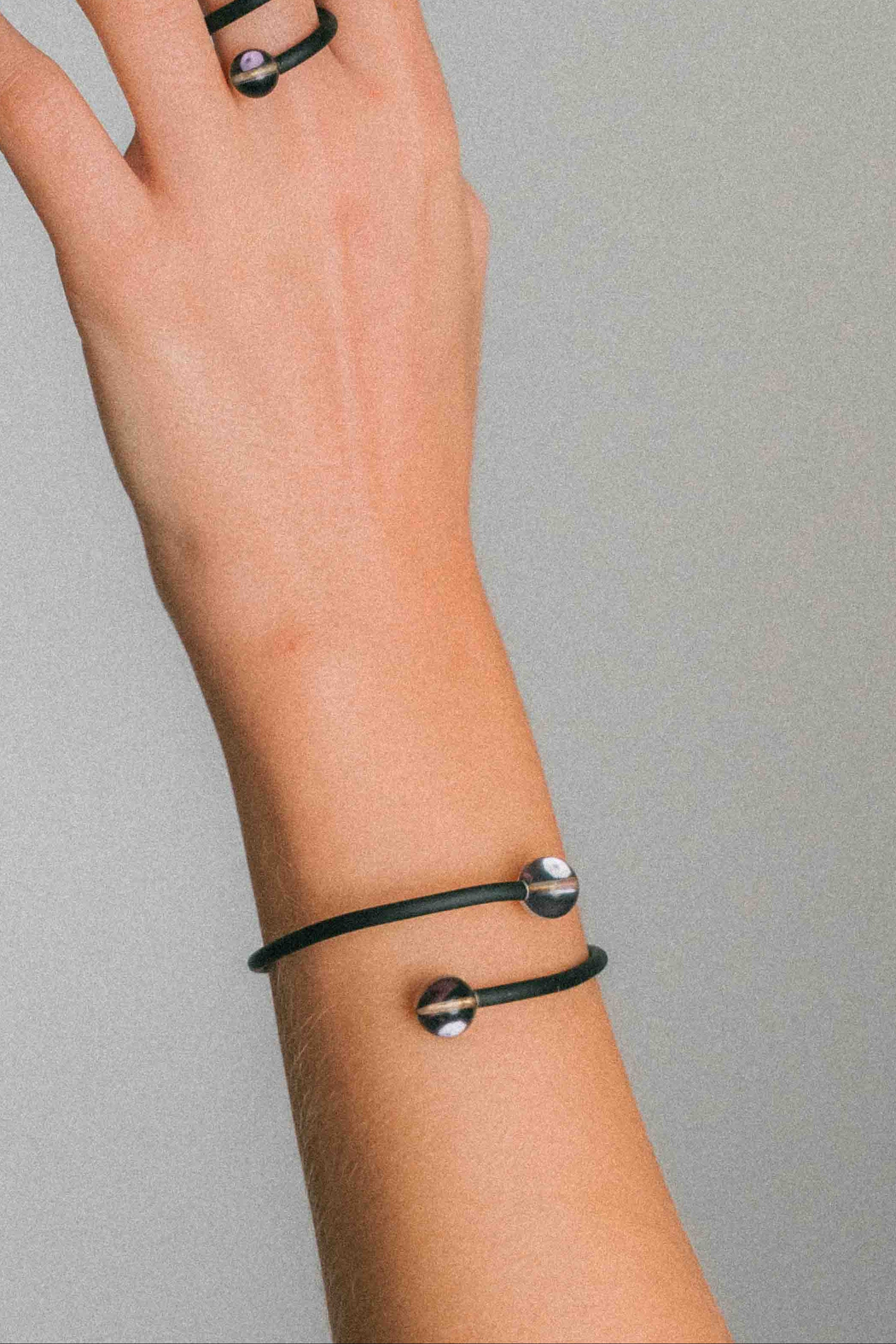 Realizado en metal flexible recubierto de elastómero técnico, se adapta al contorno de la muñeca con un gesto ligero y cómodo. Los extremos se rematan con cristal bicolor transparente y negro, creando un contraste sutil que dialoga entre luz y sombra.