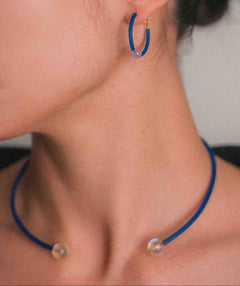 El caucho azul iriscente dibuja una línea limpia y flexible que se cierra con un vidrio iriscente, capaz de reflejar la luz y revelar matices cambiantes según el movimiento.